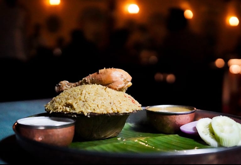 Naati Donne Chicken Biryani is a fragrant, flavorful dish made with Jeera Samba rice, tender meat, and a blend of aromatic spices.